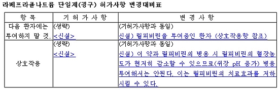 식약처는 라베프라졸나트륨 단일제 허가사항에 '릴피비린을 투여중인 환자에는 투여하지 말 것'을 추가하기 위해 업계 의견을 듣는다.