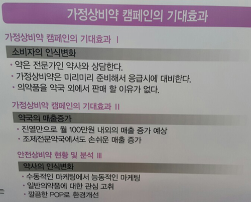 약사회는 "상비약 캠페인의 기대 효과는 크게 소비자 인식변화와 약국 매출증가, 약사의 인식 변화로 나눌 수 있다"며 "약은 전문가인 약사와 상담해야 하고, 가정상비약은 미리 준비해 응급시 대비해야 해 약을 약국 외에서 판매할 이유가 없다는 인식을 심어줄 수 있다"고 설명했다.