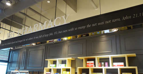 "공간은 크지 않지만 넉넉하고 풍요로운 약국을 만들고 싶었습니다. 약국 이름을 궁금해하실 분들을 위해 카운터 위에 설명 겸, 인테리어 겸 성경 구절을 새겨놓았습니다."