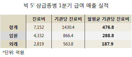 또 올해 1분기 동안 '빅 5' 1곳당 벌어들인 급여 매출 규모는 1430억4000만원. 이 중 입원은 866억4000만원, 외래는 563억8000만원으로 집계됐다.