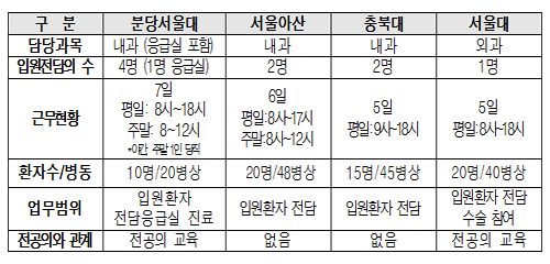 7일 복지부가 건강보험정책심의위원회에 보고한 '입원전담전문의 민간시범사업 현황'에 따르면 서울대병원, 분당서울대병원, 서울아산병원, 충북대병원 등 4개 병원이 지난해 9월부터 올해 2월까지 6개월간 입원전담전문의 민간시범사업에 참여했다.