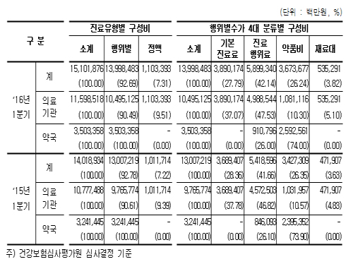 행위별 수가 진료비는 기본진료료 27.8%(3조 8902억원), 진료행위료 42.1%(5조 8993억 원), 약품비 26.2%(3조 6737억 원), 재료대 3.8%(5353억 원) 등으로 구성됐다.