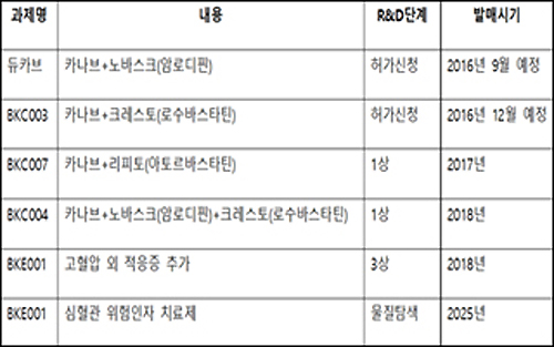 보령제약은 카나브와 고지혈증치료제(로수바스타틴) 복합제도 허가신청을 완료하였으며 연내 출시할 예정이다.