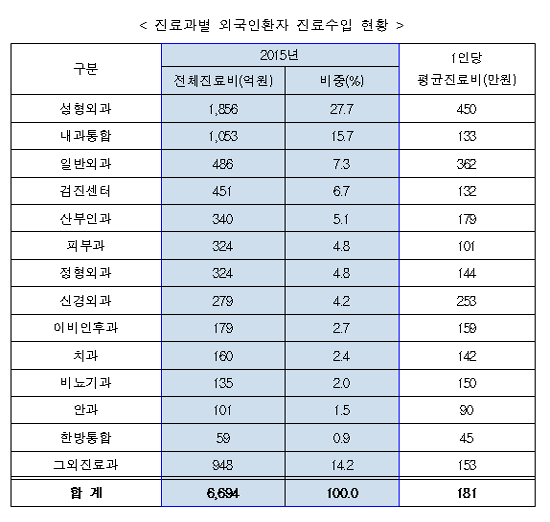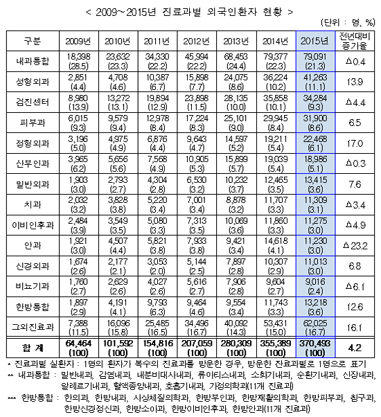 진료과목별로는 내과 8만명(21.3%), 성형외과 4만명(11.1%), 건강검진 3만명(9.3%) 등의 순으로 많았다.