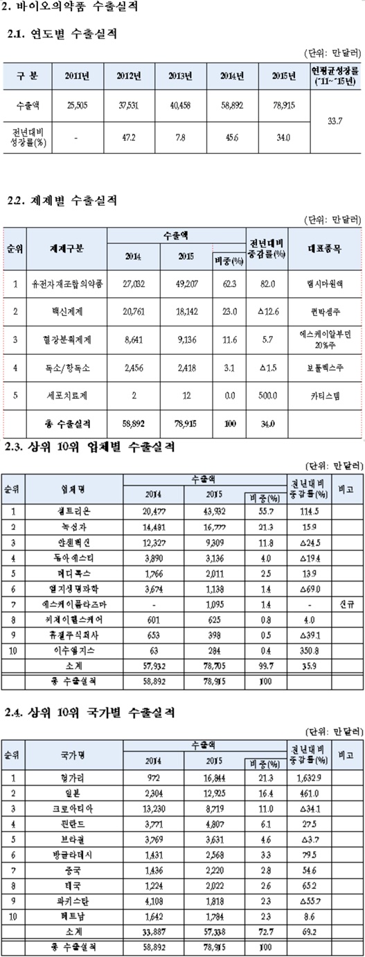 바이오약 수출은 최근 5년간 연평균 33.7% 고속성장을 유지중이었다. 수입은 2014년 8억7669만불 대비 15.8% 감소한 7억3822만불을 기록, 5093만불(576억원) 무역흑자를 달성했다.