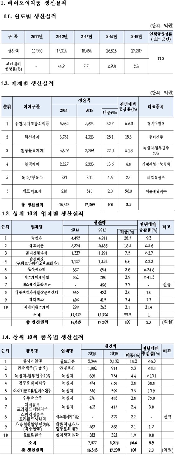 지난해 국내 바이오약 시장규모는 전년 1조9849억원 대비 16.2% 감소했는데, 생산실적에는 큰 변동이 없는 상황에서 수출이 늘고 수입은 감소한데 따른 것이다.