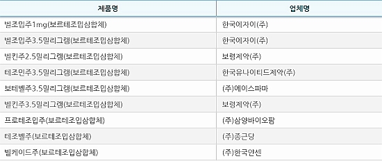 에자이는 최근 식품의약품안전처로부터 오리지널 벨케이드(보르테조밉·얀센)3.5mg 대비 용량을 크게 줄인 1mg 짜리 ' 벨조밉주'를 허가받았다.
