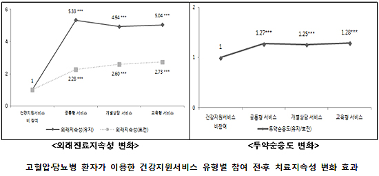 교육형 서비스의 외래진료 지속성이 유지 또는 호전될 가능성은 2.7배에서 최대 5배, 투약순응도가 유지 또는 호전될 가능성은 1.28배 각각 증가했다.