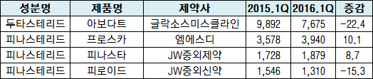 이어 프로스카(MSD)와 피나스타(JW중외제약), 피로이드(JW중외신약) 순이었다.