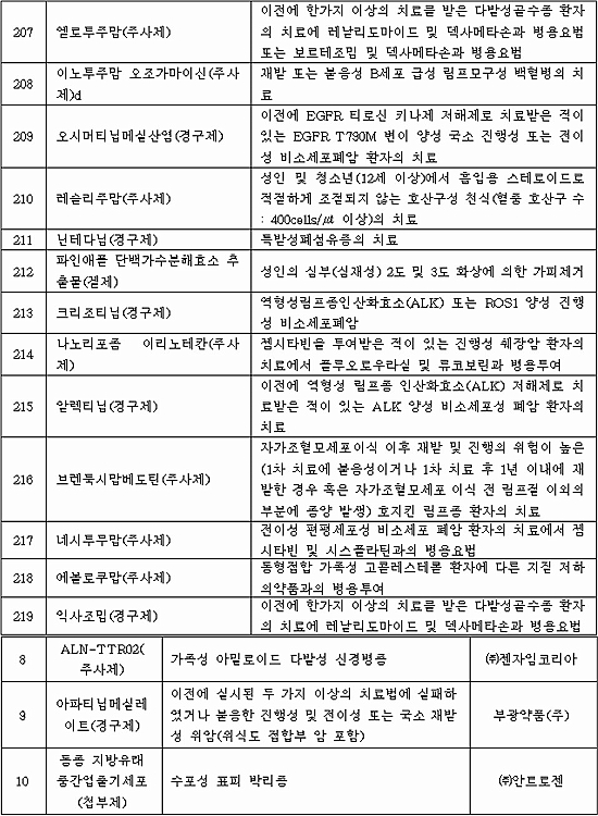 신규 지정될 의약품은 ▲BMS·애브비 다발성골수종 신약 엘로투주맙(제품명 엠플리시티) ▲화이자 ALL신약 이노투주맙, ALK 타깃 폐암약 잴코리(크리조티닙) ▲베링거인겔하임 특발성폐섬유화증 신약 닌테다닙 ▲로슈 ALK타깃 폐암 신약 알렉티닙 ▲다케다 림프종약 브렌툭시맙, 다발성골수종약 익사조밉 ▲릴리 폐암신약 네시투무맙(제품명 포트라자) ▲암젠 PCSK억제 바이오 고지혈증약 에볼로쿠맙 ▲파인애플 단백가수분해효소 등이다.