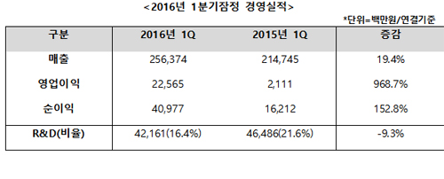 영업이익은 전년 동기대비 968.7% 증가한 226억원이며 순이익은 152.8% 증가한 410억원을 기록했다. R&D투자액은 매축의 16.4%에 해당하는 422억원이 투자됐다.