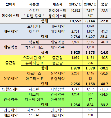 제일약품도 넥실렌 에스를 새로 출시했지만, 기존 넥실렌이 46%나 떨어지면서 전체적으로 14% 하락했다.