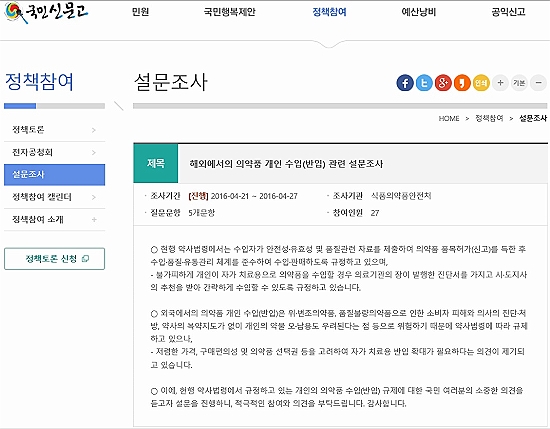 21일 식품의약품안전처는 국민신문고 내 정책참여 코너에 '해외 의약품 개인 수입(반입) 관련 설문조사'를 게재했다. 설문은 총 5개 문항으로, 오는 27일까지 전 국민을 대상으로 진행된다.