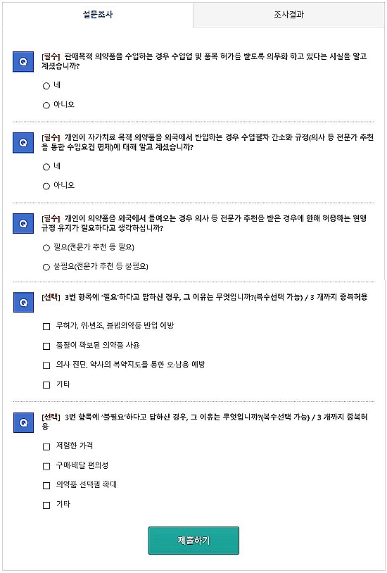 주요 설문 내용은 ▲의약품 수입허가 의무화 인지 여부 ▲의사 등 추천 통한 자가치료 목적 의약품의 개인수입 간소화 규정 인지 여부 ▲의사 추천 간소화 규정 유지 관련 찬·반 질문 ▲찬·반 견지 이유 등이다.