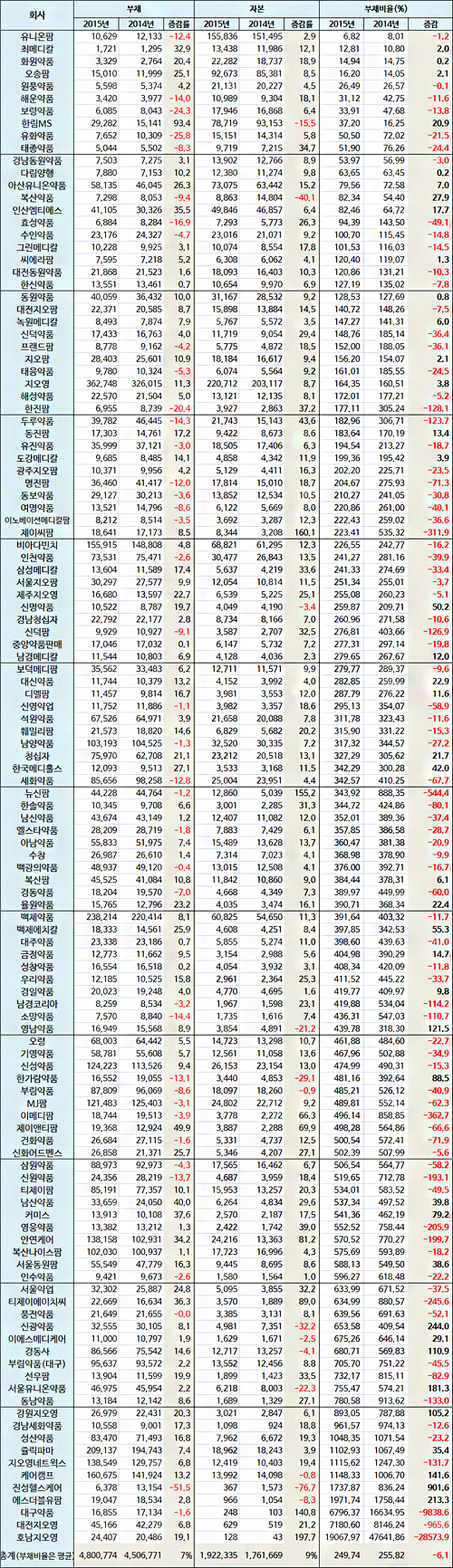 한해 동안 부채비율을 100% 이상 줄인 곳도 한진팜, 두루약품 등 17곳이나 된다.