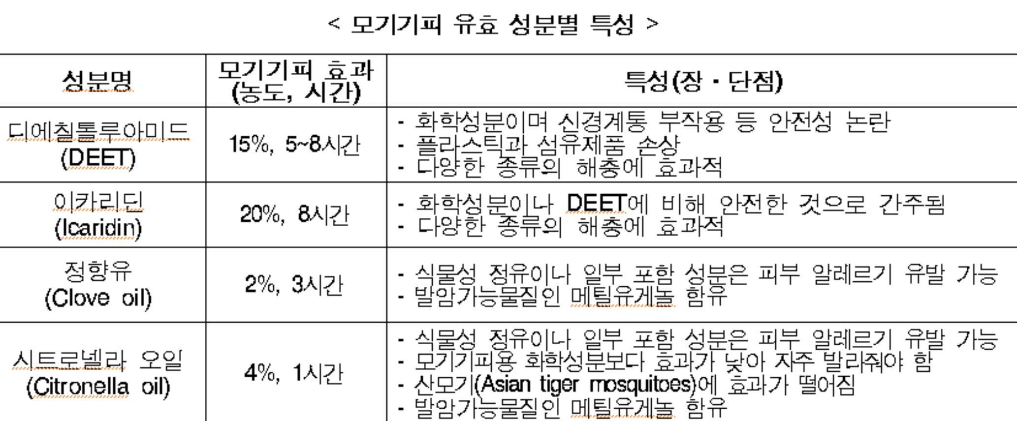 식약처, 모기기피제 안전성여부 재평가 관심 식약처의 모기기피제 재평가 결과도 관심 포인트다. 식품의약품안전처(이하 식약처)가 정향유, 시트로넬라 오일 등 성분이 포함된 모기기피제가 사람에게 안전한지 조사 중이기 때문이다.