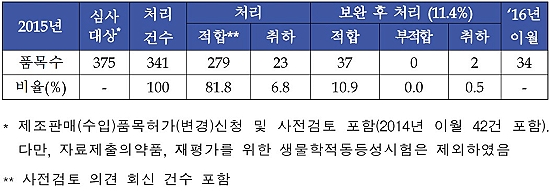자료보완 없이 적합 처리된 품목은 279건으로 81.8%였고, 보완 후 적합판정 품목은 37건으로 10.9%를 차지했다. 최종 적합 처리된 품목은 316건(92.7%), 취하된 품목은 25건(7.3%)이었다.