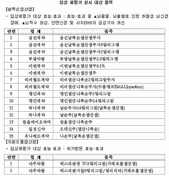 날록손염산염제제의 경우 전체 효능·효과 중 ▲뇌졸중, 뇌출혈로 인한 허혈성 뇌신경장애 ▲뇌척수 좌상, 안면신경 및 사지마비의 급성기의 개선 등에 대한 재평가 임상을 실시해야 한다. 지페프롤염산염은 ▲(정제)기도감염 폐의 급만성감염으로 인한 진해거담 ▲(시럽제)진해·거담: 급만성 호흡기질환으로 인한 기침의 완화와 거담 등이 입증대상이다.