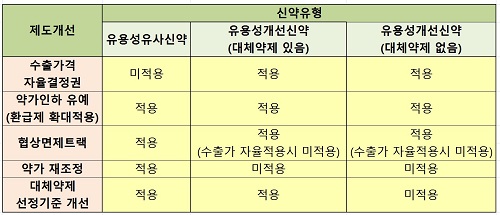 이를 통해 신약 R&D 투자비를 조기회수하고, 글로벌 진출에 필요한 해외임상, 시설증축에 소요되는 투자비를 지원할 뿐 아니라, 특허만료 후 일괄인하에 따른 재정손실을 만회하고 제네릭 제품의 빠른 시장침투를 유도할 수 있다는 장점을 갖는다.