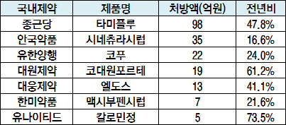 독감환자 급증으로 항바이러스제제인 '타미플루캡슐(판매 종근당)'은 2월 한달만 98억원의 처방액을 기록했다. 같은달 27일부터 한미약품이 타미플루의 대항마로 내세운 '한미플루'도 초반부터 공급량이 넘치고 있다는 전언이다.