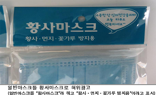 그러나 적발된 업체들을 보면 A사는 유명브랜드 일반마스크를 식약처 의약외품으로 허가받은 제품인 것처럼 '식약청 인증 황사 스모그 방지'라고 표시해 마치 보건용마스크인 것처럼 광고하고 판매했다.