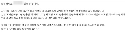 온라인몰 관계자는 "정확한 반품 물량은 집계할 수 없지만, 평소보다 훨씬 많아진 건 사실"이라며 "반품, 정산 기간을 충분히 잡고 공지를 미리 띄운 것은 약국이 미리 상황을 인지하도록 해 컴플레인을 줄이고자 한 것"이라고 설명했다.