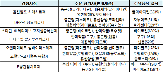 그 중심에 종근당이 있다. 종근당은 올해부터 당뇨병치료제 자누비아, 자누메트 , 고지혈증복합제 바이토린·아토젯, 치매치료제 글리아티린 등 각 영역별 1위 제품들을 판매하면서 다른 상위사들과 경쟁관계에 놓였다.