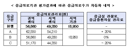 구체적으로 2016년도 평가에서 A등급을 받은 기관은 응급의료수가를 10~20% 가산하고, C등급은 10~20% 감액한다. C등급은 법정기준 미충족 기관에 부여된다.