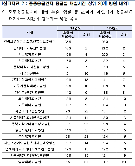 중증응급환자가 수술장, 병실 등으로 올라가지 못하고 응급실에 머무는 재실시간은 센터급 기관 평균 2014년도 6.3시간에서 2015년도 6.9시간으로 오히려 더 늘었다. 또 상위 20개 기관은 14기간으로 변화가 없었다.