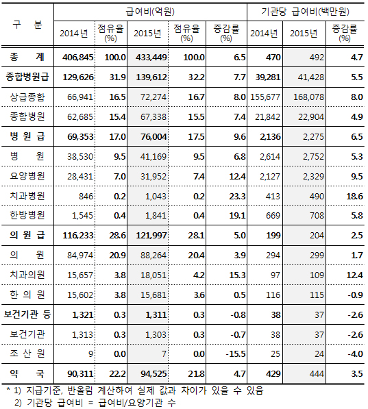 병원급 이상 진료비 점유율은 48.6%, 의원급 28.5%, 약국 22.6% 등을 기록했으며, 전체 기관당 진료비는 4.8%, 병원급 6.4%, 종합병원급 5.3%씩 늘었다.