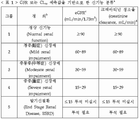 예를들어 기존에는 GFR·크레아티닌 청소율 수치가 80 이상인 환자군을 정상신기능 환자로 정의한 반면, 개정안은 90 이상을 정상으로 본다.
