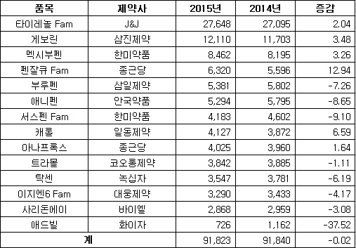 데일리팜이 25일 IMS헬스케어 자료를 2015년 주요 진통제 매출액을 분석한 결과, 대부분 품목들은 전년대비 10% 내외 증감률을 기록했다. 단 서방형, 여성용, 유아용, 복합제 등 다양한 제제가 존재하는 품목들은 매출의 합으로 집계했다.