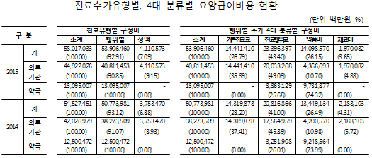 지난해 진료수가 유형별 총진료비는 행위별수가가 92.91%(53조9064억원), 정액수가가 7.09%(4조1106억원)로 구성되며, 행위별수가는 기본진료료가 26.79%, 진료행위료가 43.4%, 약품비 26.15%, 재료대 3.65%의 구성비를 보였다.