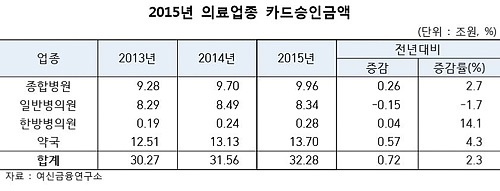 약국은 절대 결제액수 뿐 아니라 전년대비 5700억 원이 증가, 한방병의원 다음으로 높은 4.3%의 증가율을 보였다. 의료업종 전체 카드승인금액은 32조2800억 원으로 나타났으며, 전년보다 7200억 원 늘어났다.