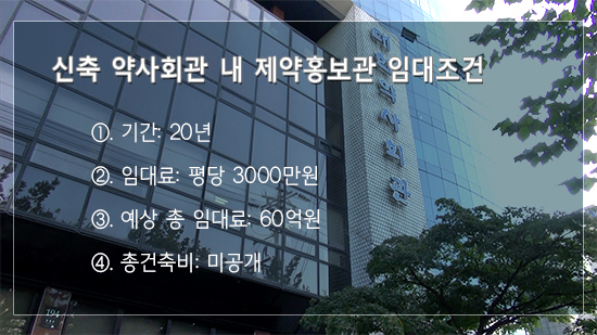 약사회 제시 조건은 20년간 공간 임대며, 평당 임대료는 3000만원이다. 200평이 모두 채워지면, 총 임대료는 60억원에 이른다.