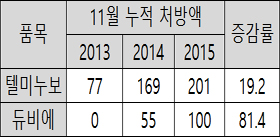 텔미누보는 2013년 발매해 3년 만에 200억 고지를 점령했고, 듀비에는 2014년 발매 후 2년 만에 블록버스터가 됐다. 시장 상황을 예측한 전략 수립과 영업력과 제품력을 동반한 힘이 시장 성공의 동력으로 풀이된다.