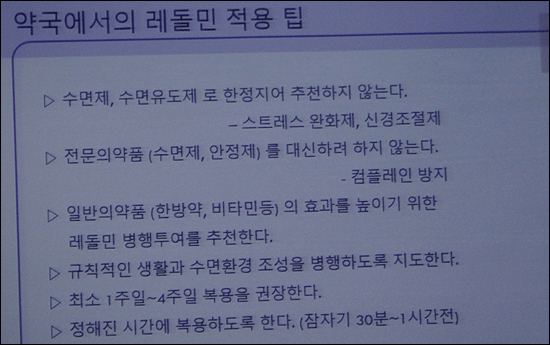 홍승혜 약사는 "약국에서 레돌민 적용 팁은 수면제, 수면유도제로 한정지어 추천하기 보다는 스트레스 완화제, 신경조절제로 상담하는 것이 긍정적"이라며 "또 컴플레인 방지 차원에서도 전문약을 대신하려 하지 않는 게 효과적"이라고 설명했다.