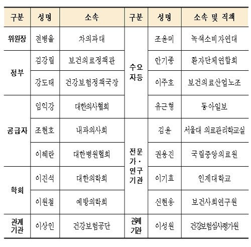 위원은 정부, 공급자, 학회, 관계기간, 수요자, 전문가·연구기관 등 18명으로 구성됐고, 위원장은 전병율 차의과대학 교수가 선임됐다.