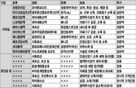 이중에는 일반의약품으로 허가를 받아 상처치료제로 광범위하게 사용되는 제품은 물론, 내시경 멸균, 혈액투석장치 멸균 등 감염우려가 우려되는 품목에 대해서는 전문의약품으로 지정해 관리되고 있는 것으로 파악됐다.