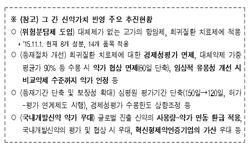 = 신약의 혁신적 가치와 임상적 유용성이 개선된 약제의 가치를 약가에 반영하기 위해 위험분담제 도입, 등재절차 개선 등 제도개선을 지속적으로 추진하고 있다. 앞으로도 글로벌 진출을 목표로 개발된 신약의 약가우대를 통해 연구개발 유인을 제공하고, 환자의 의약품 접근성을 높이는 방안을 강구해 나가겠다.