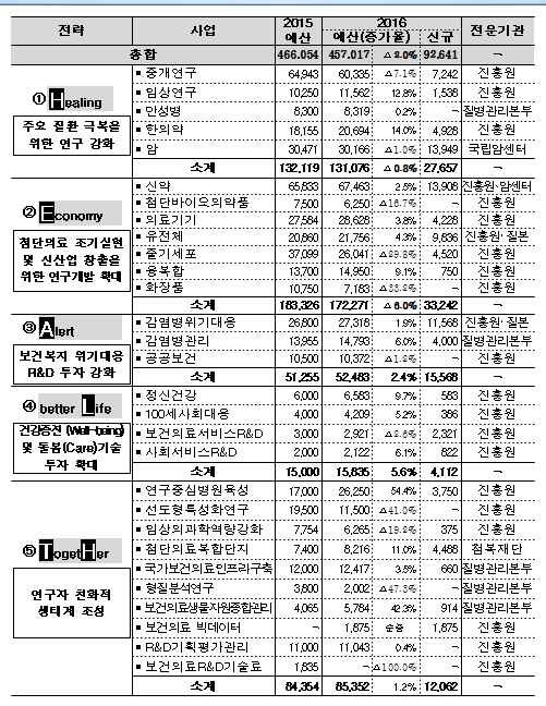 기관운영비, 국립병원 연구비 등 기타 R&D 예산 753억원은 제외됐다. 복지부는 시행계획은 보건의료기술육성기본계획(2013~2017)의 'HEALTH 전략'과 일관성을 유지해 수립했다고 설명했다.