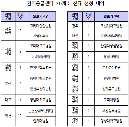 부산 지역은 동아대병원과 양산부산대병원, 대구는 영남대병원, 인천은 순천향대부천병원과 인하대병원, 광주는 조선대병원, 대전은 건양대병원, 경기 서남지역은 한림대성심병원, 경기 동남은 분당차병원, 강원 춘천 지역은 춘천성심병원이 해당 지역 중증응급환자를 책임진다.