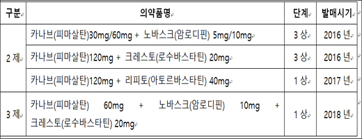 보령제약은 고지혈증치료제 크레스토(로수바스타틴) 복합제 개발을 완료하고 2016년 출시를 예상하고 있으며 1상 임상을 승인 받은 카나브+리피토(아토르바스타틴) 복합제는 2017년 출시한다는 계획이다.