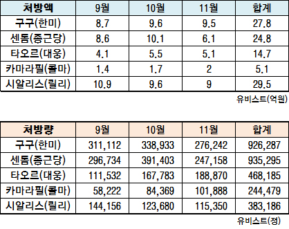시알리스는 9월 10억9000만원에서 10월 9억6000만원, 11월 9억원으로 제네릭 출시전보다 약 25% 가량 처방액이 떨어졌다.