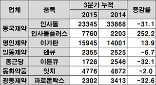 데일리팜이 9일 주요 잇몸치료제 일반약과 치약형 잇몸치료제 실적(3분기 누적, IMS데이터)을 분석한 결과 동국제약 인사돌(인사돌플러스)은 312억원대 매출을 기록해 지난해보다 실적이 약간 하락한 것으로 나타났다.