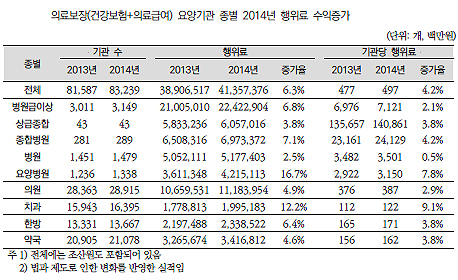 전체 의료기관의 총진료비 증가율은 6.8%로, 작년 5.75%보다 증가율이 더 높았고, 유형별로는 치과가 24.6%로 가장 높았고, 한방은 7.5%로 그 뒤를 이어 이 두 유형이 전체 진료비 증가에 크게 기여한 것으로 나타났다. 지난 5월 협상 당시 치과 유형이 고전을 거듭했던 결정적 이유이기도 하다. 반면 약국은 5.2%, 의원은 6%로 수익증가율이 다른 의료기관에 비해 낮았다. 그만큼 협상에서 다른 유형에 비해 수월하게 보험자를 설득할 수 있었던 셈이다.