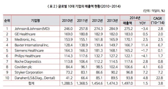 세계 의료기기 상위 10대기업의 지난해 매출액은 1497억달러로 전년대비 1.5%증가하는데 그쳤다. 특히 2013년과 2014년은 각각 1%대 성장해 2011년 6.2%, 2012년 6.3% 대비 증가율이 하락했다.