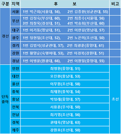 선거 입후보자 출신 대학별로 보면 조선대가 5명으로 가장 많았고 중앙대 4명, 영남대 3명 순이다.