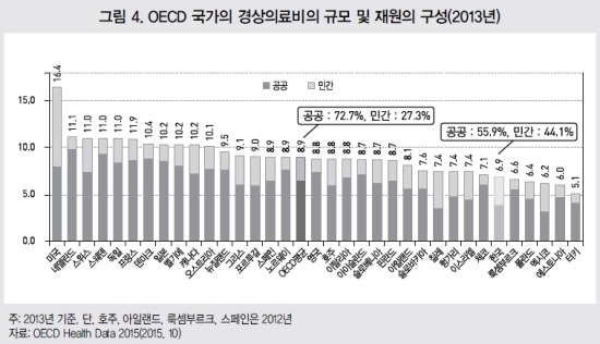 이는 대다수 OECD국가들이 의료비 재원을 공공 영역에서 충당하고 있는데 반해 한국은 민간이 지출하고 있음을 의미한다.