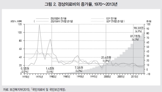 GDP 대비 경상의료비 비율은 1970년 2.7%에서 2013년 6.9%로 급격히 상승했다. 경상의료비의 명목증가율은 1970년대 33.8%, 1980년대 18.2%, 1990년대 13.3%, 2000년대 12.4%, 2010~2013년 6.3%로 차츰 증가세가 둔화됐으나, 경제성장률보다 높은 수준을 유지중이다.